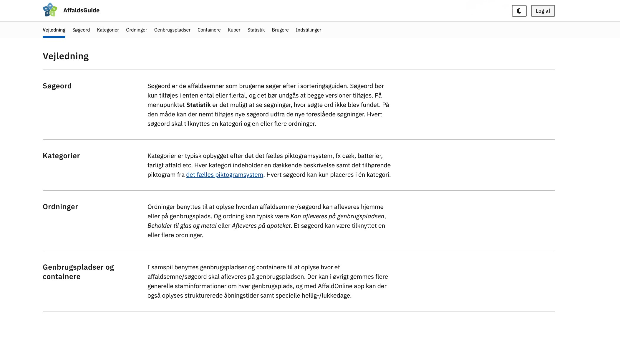 Et administrativt værktøj til at oprette og vedligeholde jeres sorteringsvejledninger til både husstandsaffald og aflevering på genbrugspladser.