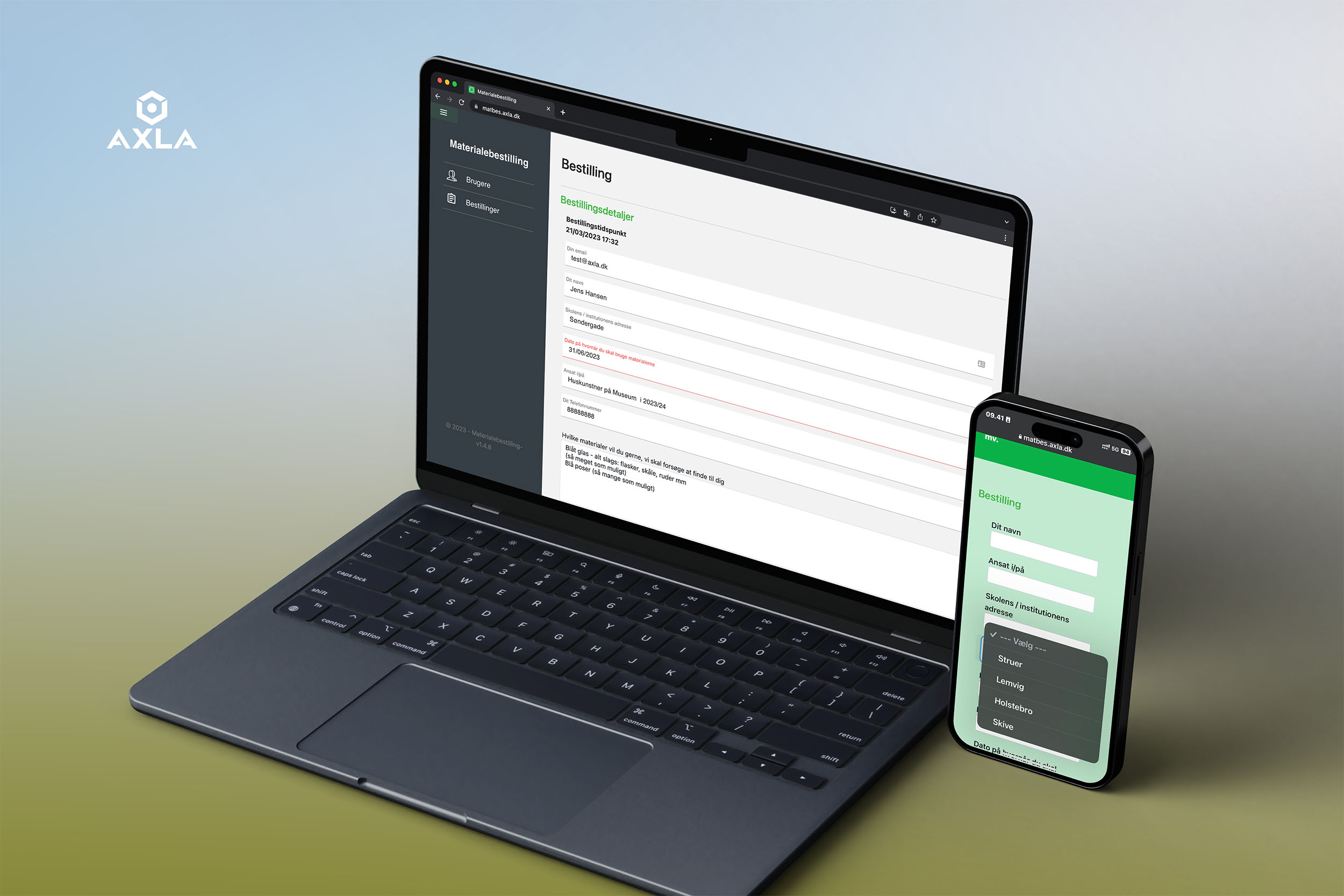 Axla udviklede Materialebestillingssystemet, der erstatter den manuelle registrering med en automatiseret proces. Når en skole eller institution sender en bestilling, går den direkte ind i systemet, hvor data automatisk gemmes og sendes videre til de rette medarbejdere på genbrugspladsen. På genbrugslageret finder personalet materialet frem og gør det klar til afhentning. Når materialet kan afhentes, får bestilleren besked.