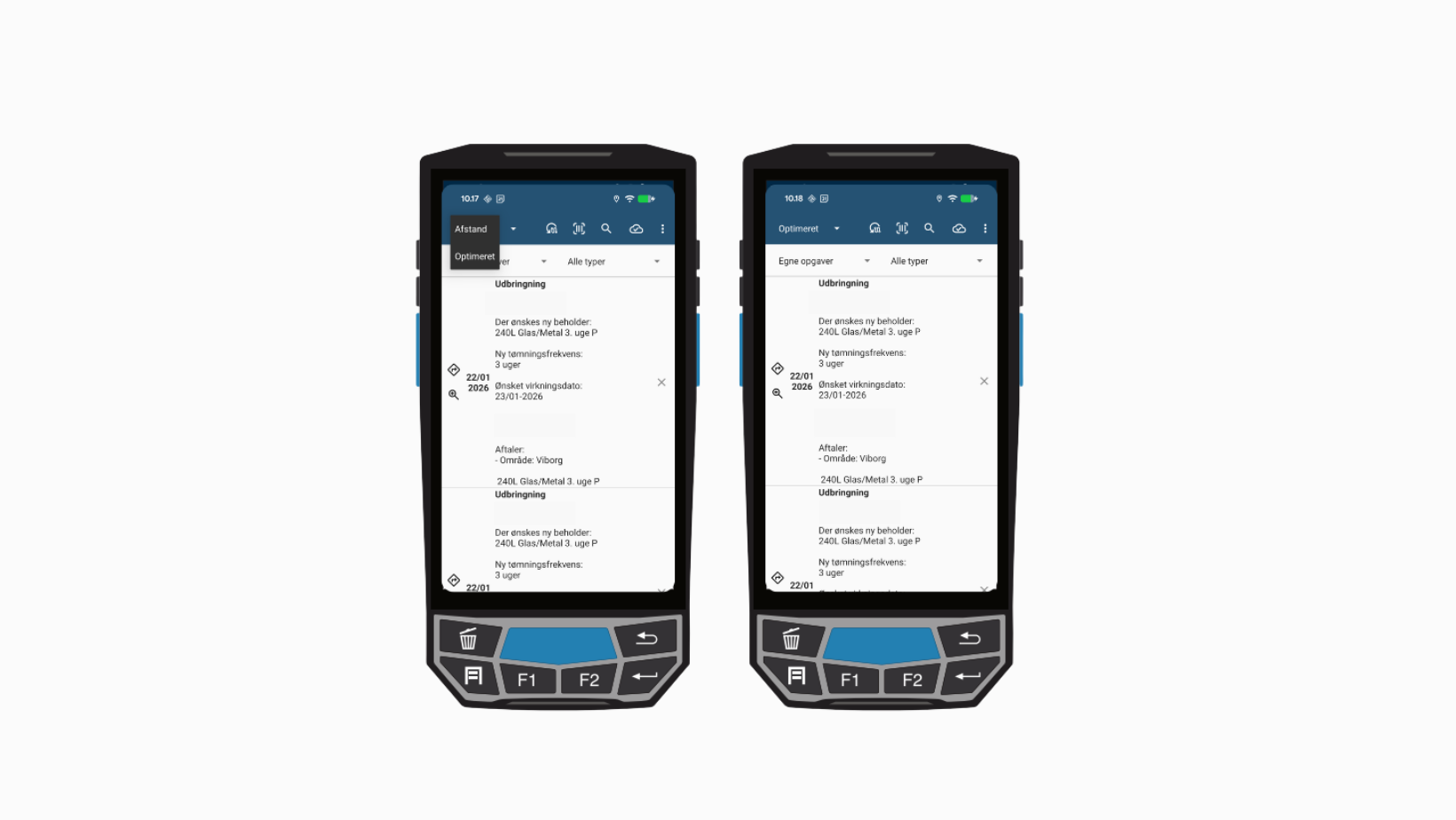 Ruter optimeres ved at klikke på knappen øverst i venstre hjørne. Når ruteoptimering er aktiveret, får chaufføren automatisk en optimeret rækkefølge på dagens opgaver, så ruten bliver så hensigtsmæssig som muligt rent kørselsmæssigt.